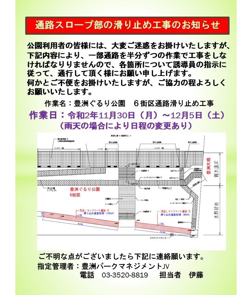 豊洲ぐるり公園 豊洲大橋脇 通路スロープの滑り止め工事のお知らせ お知らせ 豊洲ぐるりパーク 江東区 豊洲ふ頭内公園