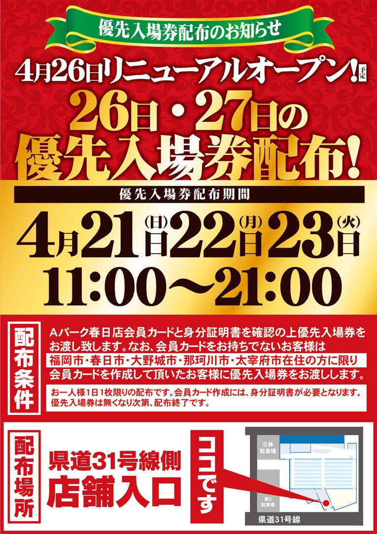 データベース7 Db7 على تويتر 新台入替 リフレッシュ リニューアル 4月21日 日 グランドop予定 Aパーク春日 4 26リニューアルop 4 21から整理券配布 エーワン福智店 4 25 グランドop 4 19 4 21の三日間の12時 19時まで優先整理券配布 新台入替